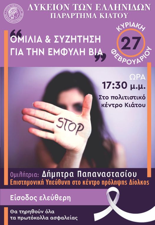 Το Λύκειο Ελληνίδων διοργανώνει την Κυριακή 27 Φεβρουαρίου στο Πολιτιστικό Κέντρο Κιάτου, ομιλία και συζήτηση για την έμφυλη βία.