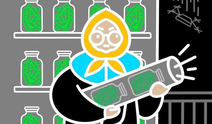 Στο διαμέρισμά της υπήρχε ένα παλιό κυνηγετικό όπλο του πατέρα της, με το οποίο θα μπορούσε να πλήξει την εχθρική συσκευή. Αλλά δεν είχε τον χρόνο να πάει στο δωμάτιό της για να ψάξει να το βρει –άσε που δεν ήξερε καν αν θα λειτουργούσε. Εκτός αυτού μέχρι να επιστρέψει το drone θα είχε εξαφανιστεί. Αντίθετα, βάζα γεμάτα με σπιτικές πίκλες, ντοματάκια, αγγουράκια, πιπεριές και άλλα τρόφιμα στέκονταν τακτικά τοποθετημένα στο μικρό ντουλαπάκι.