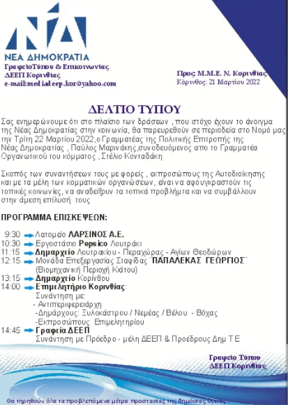 Η περιοδεία θα ολοκληρωθεί με σύσκεψη στα γραφεία της ΔΕΕΠ Κορινθίας.