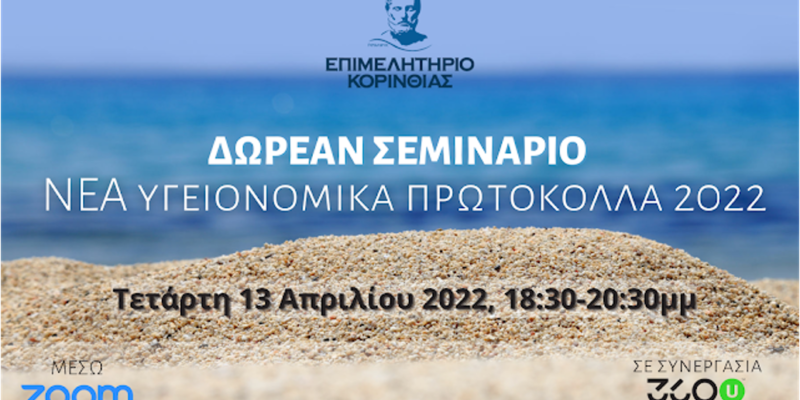 Το Επιμελητήριο Κορινθίας ενημερώνει τα μέλη του ότι προσφέρει ΔΩΡΕΑΝ τηλεκπαίδευση στα ΝΕΑ Υγειονομικά Πρωτόκολλα 2022 και στην ισχύουσα νομοθεσία σύμφωνα με την ΚΥΑ 4634 (ΦΕΚ Β’1223/17.03.2022) και τίτλο «Τροποποίηση της υπ’ αρ. 6632/16.04.2021 κοινής υπουργικής απόφασης με τίτλο «Αντικατάσταση της υπ’ αρ. 1881/29.05.2020 κοινής υπουργικής απόφασης με τίτλο “Ειδικά πρωτόκολλα υγειονομικού περιεχομένου βάσει των οποίων λειτουργούν οι τουριστικές επιχειρήσεις στο πλαίσιο της λήψης μέτρων έναντι του κορωνοϊού COVID-19” (Β’ 1632) και τη διόρθωση σφάλματος που δημοσιεύθηκε στο τ.Β’ 1996/2021».