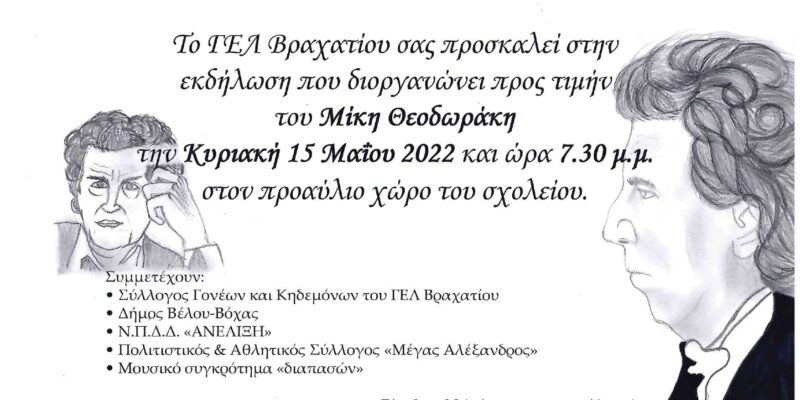 Την Κυριακή 15 Μαϊου 2022 και ώρα 7.30 μ.μ. το Γενικό Λύκειο Βραχατίου διοργανώνει εκδήλωση στη μνήμη του Μίκη Θεοδωράκη.
