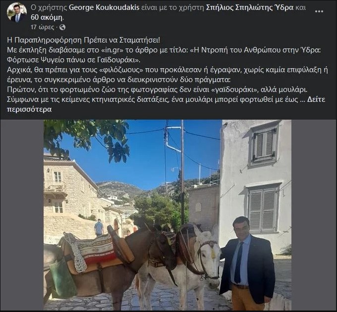 Μεταξύ άλλων στην ανάρτηση ο κ. Κουκουδάκης αναφέρει ότι «αυτό που όλοι γνωρίζουμε στο νησί μας είναι ότι η συντριπτική πλειοψηφία των αγωγιατών της Ύδρας φροντίζει και περιποιείται τα ζώα εργασίας με ιδιαίτερο ζήλο. Αυτό συμβαίνει όχι μόνο επειδή τα ζώα αυτά τους εξασφαλίζουν τα προς το ζην, αλλά πρωτίστως διότι οι ίδιοι είναι φορείς φιλοζωϊκής κουλτούρας στην πράξη και όχι στα λόγια».