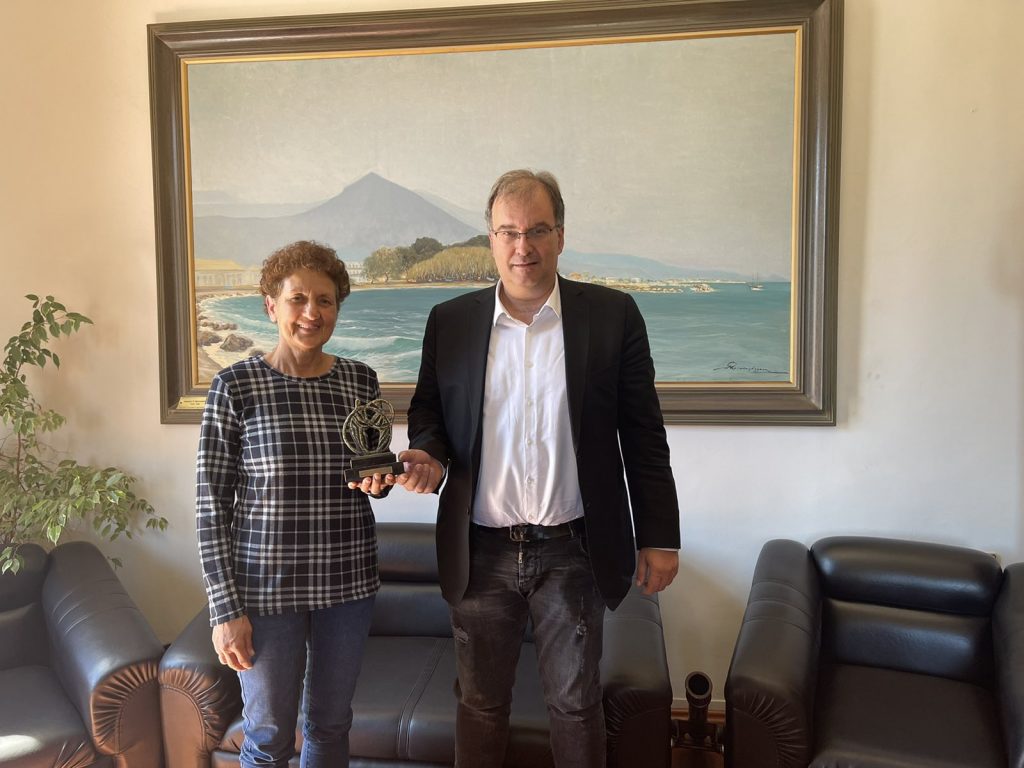 Ο Δήμαρχος συνεχάρη την κα Φιλιππάκη για τις επιτυχίες της και της παρέδωσε ένα μικρό αγαλματίδιο το οποίο έχει φιλοτεχνηθεί από το διακεκριμένο γλύπτη Αριστείδη Πατσόγλου. Το συγκεκριμένο αγαλματίδιο βασίστηκε σε μία ιδέα της Αντιδημάρχου Κας Μενούνου.