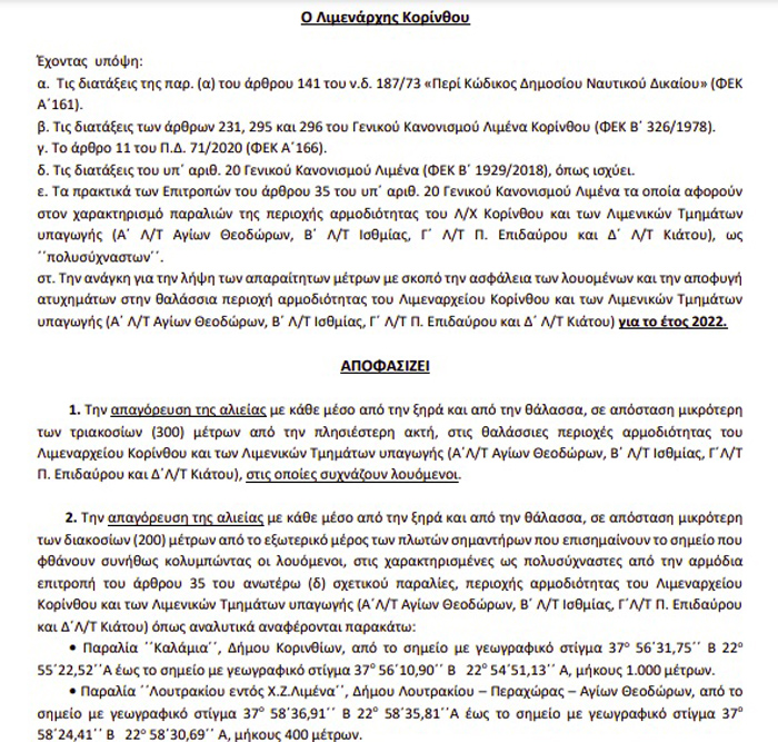 - Την απαγόρευση της αλιείας με κάθε μέσο από την ξηρά και από την θάλασσα, σε απόσταση μικρότερη των τριακοσίων (300) μέτρων από την πλησιέστερη ακτή, στις θαλάσσιες περιοχές αρμοδιότητας του Λιμεναρχείου Κορίνθου και των Λιμενικών Τμημάτων υπαγωγής (Α΄Λ/Τ Αγίων Θεοδώρων, Β΄ Λ/Τ Ισθμίας, Γ΄Λ/Τ Π. Επιδαύρου και Δ΄Λ/Τ Κιάτου), στις οποίες συχνάζουν λουόμενοι.