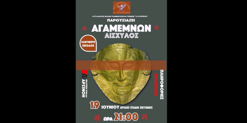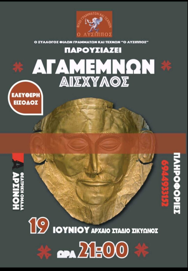 Ο Αγαμέμνων του Αισχύλου παρουσιάζεται στο Αρχαίο στάδιο Σικυώνας στις 19 Ιουνίου 9μμ με ελεύθερη είσοδο από την Θεατρική ομάδα “Αρσινόη”. Την παράσταση φιλοξενεί ο πολιτιστικός σύλλογος ,Φίλοι γραμμάτων και τεχνών ο “Λύσιππος”