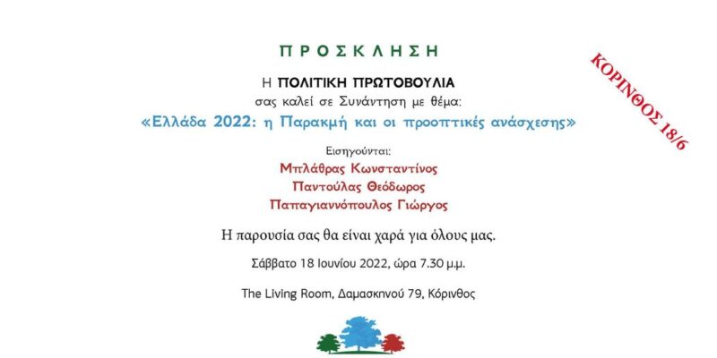 Μία ενδιαφέρουσα πολιτική εκδήλωση θα πραγματοποιηθεί αύριο, Σάββατο (18 Ιουνίου 2022), στις 7.30 το απόγευμα στο αίθριο του cafe Living Room, (Δαμασκηνού 79 Κόρινθος).