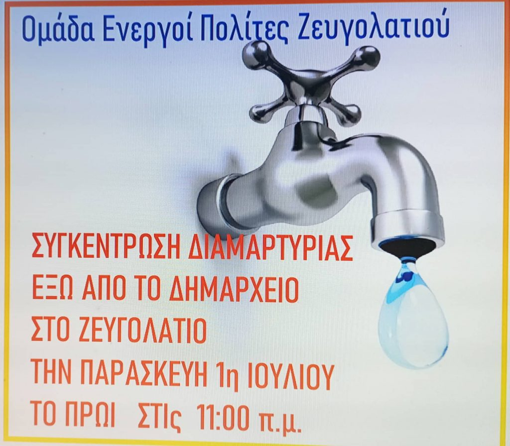 Συγκέντρωση διαμαρτυρίας έξω από το δημαρχείο του Ζευγολατιού πραγματοποιούν την Παρασκευή 1η Ιουλίου στις 11:00 το πρωί οι “Ενεργοί Πολίτες Ζευγολατιού”, για την έλλειψη νερού στα σπίτια και τα κτήματα.