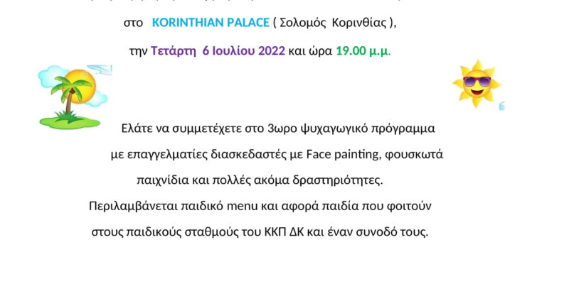 Το Κέντρο Κοινωνικής Πολιτικής Δήμου Κορινθίων προσκαλεί τα παιδιά που απασχολούνται στους παιδικούς σταθμούς του, σε μια θερινή γιορτή των βρεφονηπιακών και παιδικών σταθμών του.