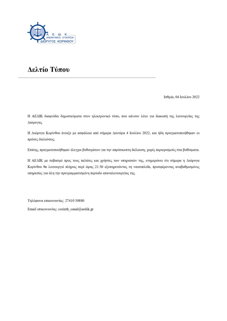 H ΑΕΔΙΚ διαψεύδει δημοσιεύματα στον ηλεκτρονικό τύπο, που κάνουν λόγο για διακοπή της λειτουργίας της Διώρυγας.