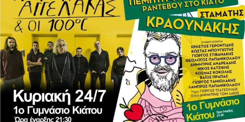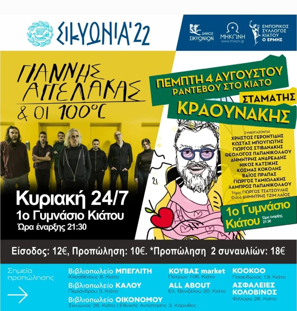 Δύο από τους πιο αγαπητούς Έλληνες καλλιτέχνες φέρνει στο Κιάτο ο οικείος Εμπορικός Σύλλογος. Ειδικότερα, στο πλαίσιο των πολιτιστικών εκδηλώσεων “Σικυώνια 2022” την Κυριακή 24 Ιουλίου στο 1ο Γυμνάσιο Κιάτου θα γίνει συναυλία του Γιάννη Αγγελάκα και του συγκροτήματος «100ο C», ενώ στις 4 Αυγούστου στον ίδιο χώρο έρχεται ο Σταμάτης Κραουνάκης και η παρέα του.