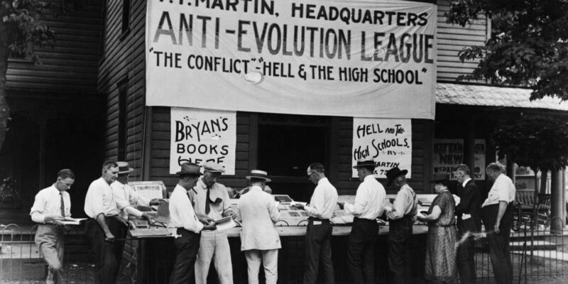 Τον Μάρτιο του 1925, απαγορεύεται στο Τενεσί των ΗΠΑ η διδασκαλία της θεωρίας της εξέλιξης στα σχολεία. Στο Ντέιτον του Τένεσι, ένας νεαρός δάσκαλος με το όνομα Τζον Σκόουπς συνελήφθη από τις αρχές και οδηγήθηκε στο δικαστήριο. Η κατηγορία ήταν απόρροια της αντιδραστικής και σκοταδιστικής εποχής που διένυε τότε η Αμερική. Ο Σκόουπς δίδαξε στους μαθητές του τη θεωρία του Δαρβίνου και γι’ αυτό οδηγήθηκε σε δίκη, η οποία ονομάστηκε «Δίκη των πιθήκων» και έμεινε στην ιστορία των ΗΠΑ ως μία από τις σημαντικότερες δικαστικές διαμάχες.