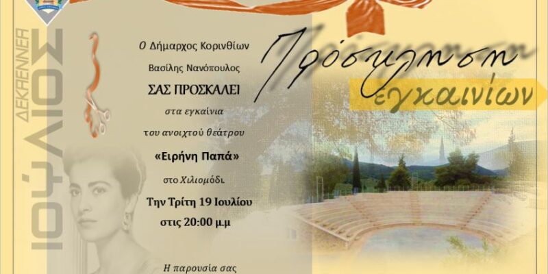 Στις 19 Ιουλίου με την κινηματογραφική ταινία “Ιφιγένεια”, του Μιχάλη Κακογιάννη, που ήταν υποψήφια για ΟΣΚΑΡ και με πρωταγωνίστρια την σπουδαία Κορίνθια ηθοποιό θα γίνουν τα εγκαίνια του νέου θεάτρου “Ειρήνη Παπά”, στο Χιλιομόδι.
