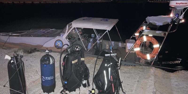 Όπως αναφέρεται στην σχετική ανακοίνωση “κατά τον έλεγχο διαπιστώθηκε ότι δυο ημεδαποί διενεργούσαν υποβρύχια αλιεία με ψαροντούφεκο με τη χρήση αυτόνομης καταδυτικής συσκευής παροχής αέρα και υποβρυχίου φωτός κατά τη διάρκεια της νύκτας.