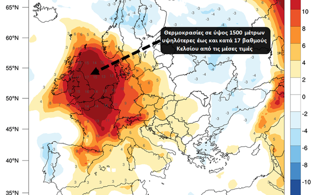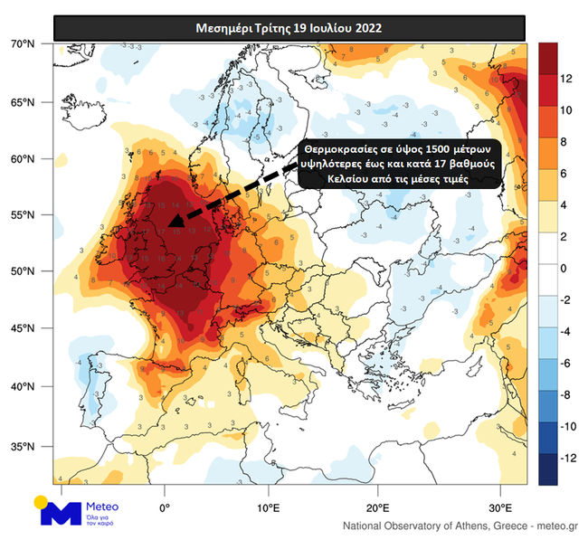 Ιδιαίτερα θερμές αέριες μάζες επικρατούν στη Δυτική Ευρώπη, προκαλώντας ισχυρό κύμα καύσωνα. Σύμφωνα με τα τελευταία προγνωστικά δεδομένα του Εθνικού Αστεροσκοπείου Αθηνών / meteo.gr το κύμα καύσωνα θα επιμείνει και τη Δευτέρα 18/07 και την Τρίτη 19/07. Όπως χαρακτηριστικά φαίνεται στις Εικόνες 1 και 2, οι αέριες μάζες σε ύψος περίπου 1500 μέτρων πάνω από την Δυτική Ευρώπη είναι έως και 16-17 βαθμούς Κελσίου θερμότερες από τη μέση τιμή της εποχής. Θερμοκρασιακές αποκλίσεις από τη μέση τιμή τόσο μεγάλου μεγέθους αποτελούν μία ακραία συμπεριφορά του καιρού. Σημειώνεται ότι η τελική διαμόρφωση της θερμοκρασίας κοντά στο έδαφος επηρεάζεται από πλήθος παραγόντων, όπως πχ η νέφωση, η εκδήλωση φαινομένων, οι άνεμοι κλπ.