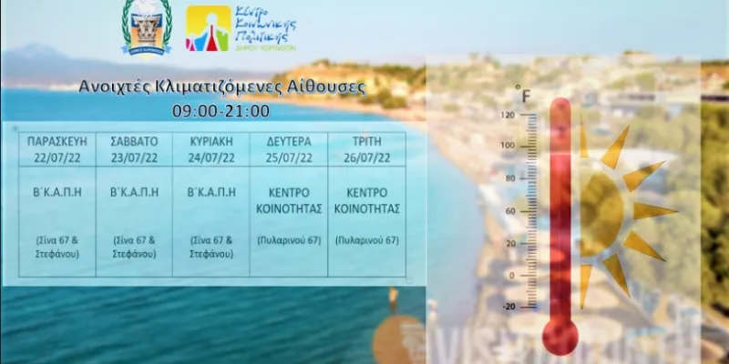 Λόγω των υψηλών θερμοκρασιών οι οποίες αναμένονται από σήμερα και στα πλαίσια προστασίας των πολιτών, ο Δήμος Κορινθίων διαθέτει από σήμερα Παρασκευή 22 Ιουλίου 2022 και μέχρι την Τρίτη 26 Ιουλίου τις κάτωθι κλιματιζόμενες αίθουσες: