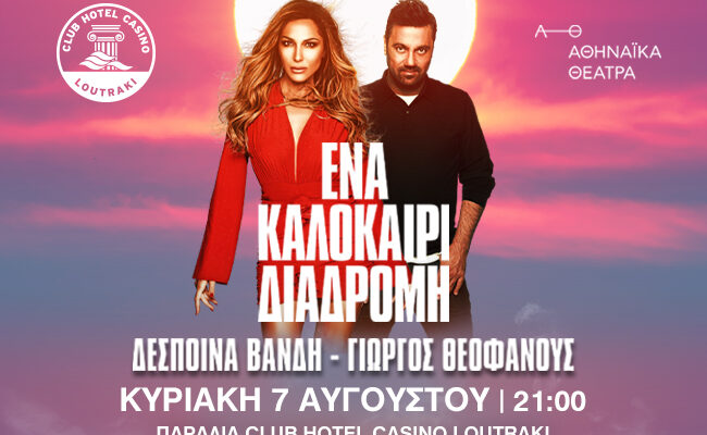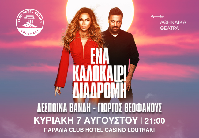 Την Κυριακή 7 Αυγούστου, με την δύση του ήλιου, η εκρηκτική Δ. Βανδή και ο μοναδικός Γ. Θεοφάνους , θα εμφανιστούν στο ειδικά διαμορφωμένο stage της promenade του Club Hotel Casino Loutraki σε ένα ατελείωτο πάρτι που όλοι ονειρεύονται.