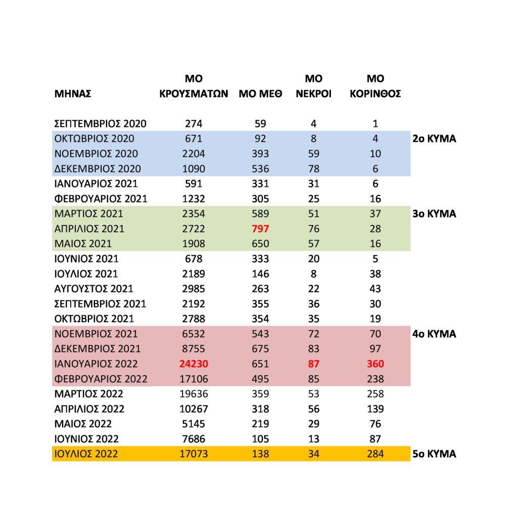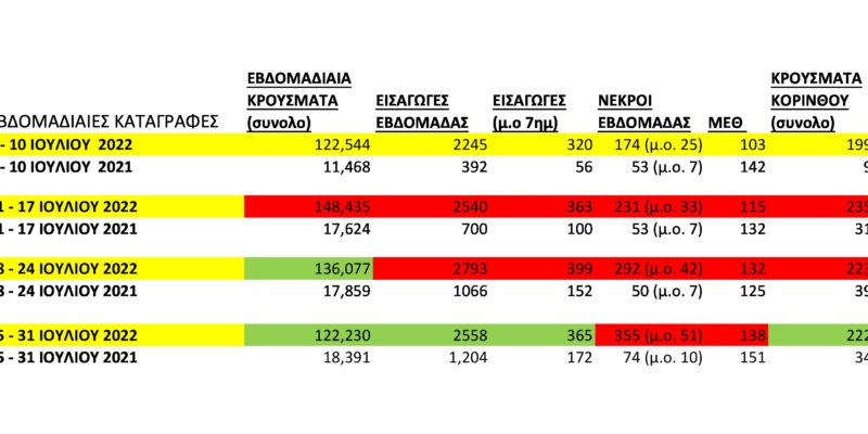 | 11 – 17 ΙΟΥΛΙΟΥ 2022 | 148.435 | 2540 | 363 | 231 (μ.ο. 33) | 115 | 2354 |