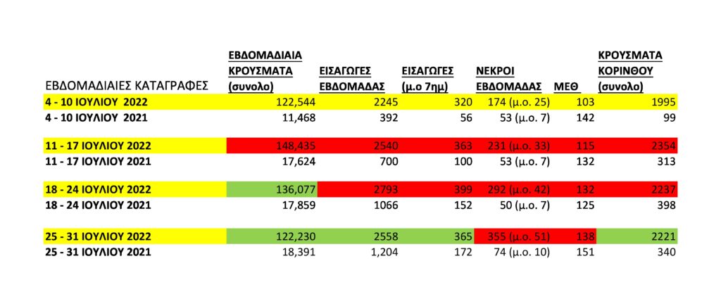 | 25 – 31 ΙΟΥΛΙΟΥ 2022 | 122.230 | 2558 | 365 | 355 (μ.ο. 51) | 138 | 2221 |