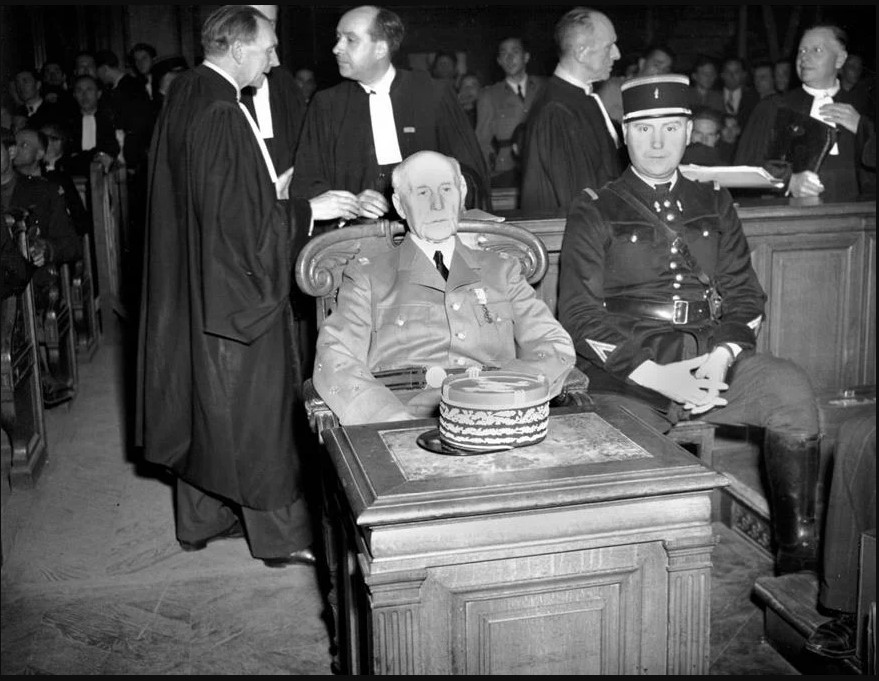 Η προσωρινή κυβέρνηση, με επικεφαλής τον Ντε Γκωλ, δίκασε τον Πετέν για προδοσία , η οποία έλαβε χώρα από τις 23 Ιουλίου έως τις 14 Αυγούστου 1945. Ντυμένος με τη στολή στρατάρχη, ο Πετέν παρέμεινε σιωπηλός καθ’ όλη τη διάρκεια της διαδικασίας, έπειτα από μια αρχική δήλωση του, ότι αρνείται το δικαίωμα του Ανώτατου Δικαστηρίου, όπως συγκροτήθηκε, να τον δικάσει. Η ετυμηγορία των δικαστών εκδόθηκε μια μέρα σαν σήμερα, 14 Αυγούστου του 1945 και ήταν «θάνατος», αλλά το προχωρημένο της ηλικίας (ήταν τότε 89 χρονών) και η συνεισφορά του στον Μεγάλο Πόλεμο τον έσωσαν. Ο Πετέν πέθανε στα 95 του το 1951.