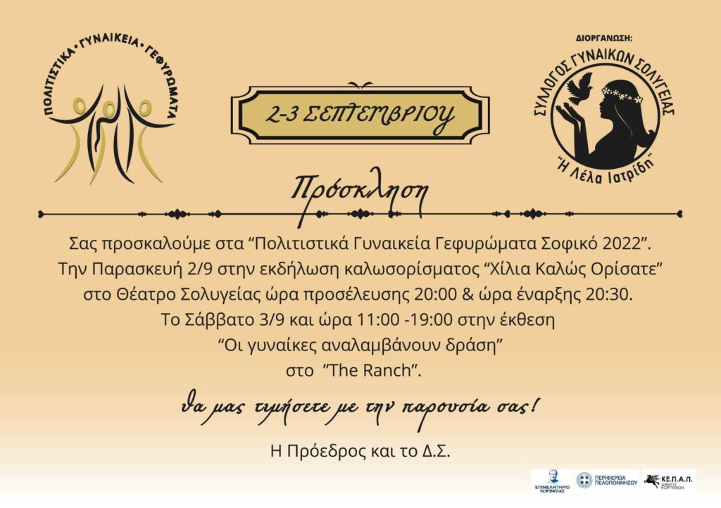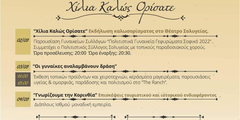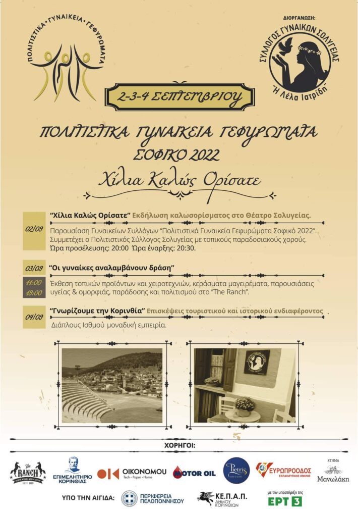 Πρόκειται για ένα τριήμερο δράσεων στις 2, 3 και 4 Σεπτεμβρίου που περιλαμβάνει την εκδήλωση καλωσορίσματος με την παρουσίαση των γυναικείων συλλόγων, “Πολιτιστικά γυναικεία γεφυρώματα Σοφικό 2022” την πρώτη μέρα, την έκθεση τοπικών προϊόντων και χειροτεχνημάτων την δεύτερη μέρα στο Ranch Skouras και τον διάπλου του Ισθμού την τρίτη ημέρα.