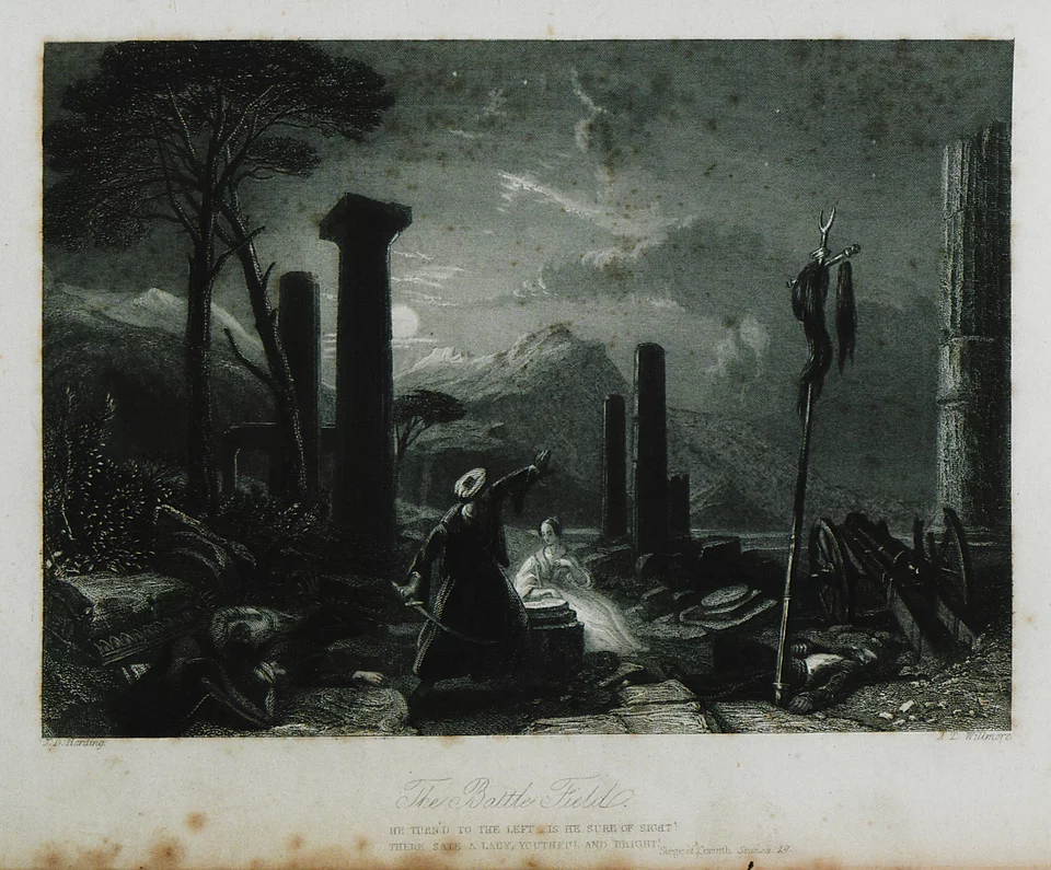 Εικονογράφηση για το ποίημα του Λόρδου Βύρωνα «The Siege of Corinth»: Oθωμανός αξιωματούχος και Ελληνίδα σκλάβα στα ερείπια του Ναού του Απόλλωνα στην αρχαία Κόρινθο. 1849