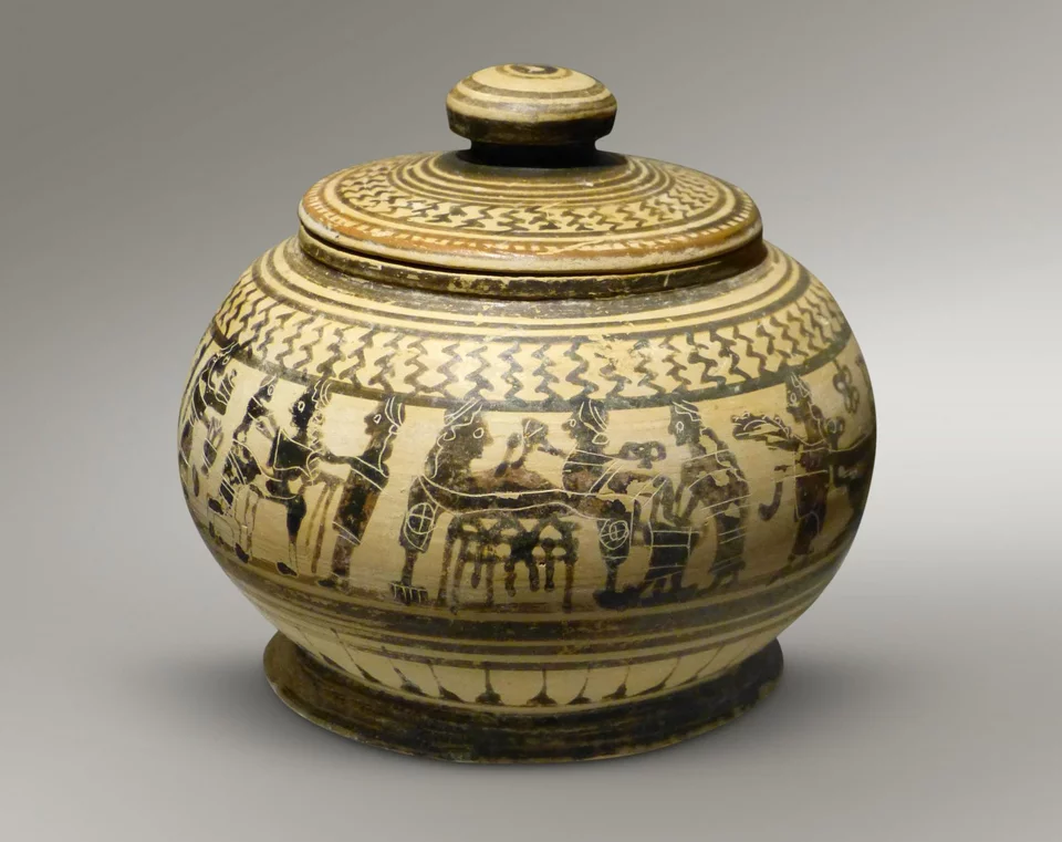 Η μελανόμορφη αυτή πυξίδα αποτελεί μία εύγλωττη και ζωντανή εικονογραφική μαρτυρία των δραστηριοτήτων