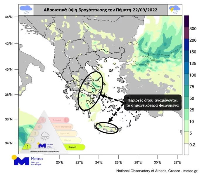 Πιο αναλυτικά, την Πέμπτη 22 Σεπτεμβρίου 2022, στα ανατολικά, στα νότια και στο Αιγαίο θα επικρατήσουν αυξημένες νεφώσεις. Βροχές και πιθανόν σποραδικές καταιγίδες θα εκδηλωθούν κυρίως στην Κρήτη, στην Ανατολική Θεσσαλία, στην Κεντρική και Ανατολική Στερεά, στην Ανατολική Πελοπόννησο, στις Σποράδες και στην Εύβοια. Τοπικές βροχές θα εκδηλωθούν επίσης σε τμήματα των Κυκλάδων.