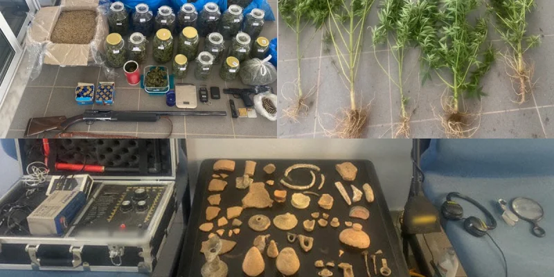Επίσης, βρέθηκαν ένα κυνηγητικό όπλο, ένα πιστόλι κρότου με γεμιστήρα, 140 φυσίγγια διαφόρων τύπων και διαμετρημάτων, 60 φυσίγγια κρότου, δύο ανιχνευτές μετάλλων, καθώς και 21 πήλινα και χάλκινα αγγεία.