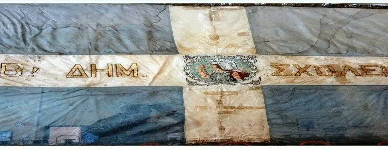 Η σημαία αυτή έχει μια ενδιαφέρουσα ιστορία, που κρατά από την περίοδο της γερμανικής κατοχή. Τότε, στο σχολείο είχαν στρατοπεδεύσει αρχικά Ιταλοί και στη συνέχεια Γερμανοί στρατιώτες. Κάποιος Γερμανός στρατιώτης πήρε την μεταξωτή και κροσσωτή σημαία του σχολείου για ενθύμιο. Σκοτώθηκε, όμως, κατά την αποχώρηση των Γερμανών στον Ισθμό της Κορίνθου και τη σημαία βρήκε στο σακίδιό του ένα Άγγλος αλεξιπτωτιστής, ο οποίος την κράτησε σαν αναμνηστικό από τον πόλεμο και την Ελλάδα.
