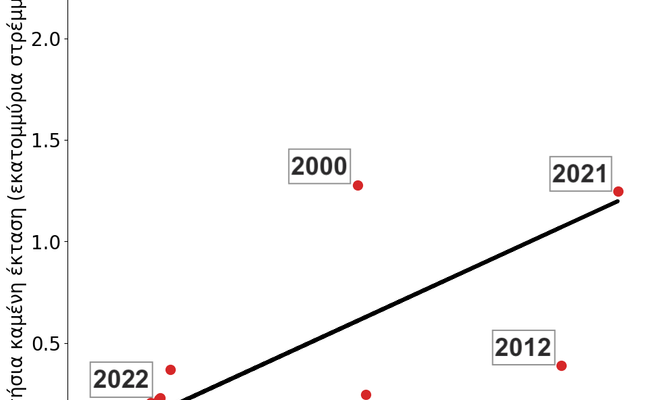 Σύμφωνα με δεδομένα του Ευρωπαϊκού Συστήματος Πληροφόρησης για Δασικές Πυρκαγιές (European Forest Fire Information System – EFFIS – https://effis.jrc.ec.europa.eu), οι καμένες εκτάσεις στη χώρα μας από την αρχή του 2022 έως και το τελευταίο δεκαήμερο του Οκτωβρίου ήταν ~ 200.000 στρέμματα, εκτάσεις που αντιστοιχούν στο ~ 46% της μέσης καμένης έκτασης στην χώρα μας κατά την περίοδο 2006–2021.