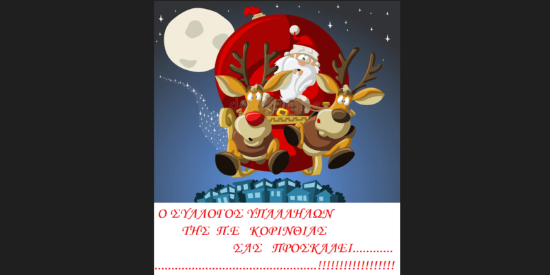 O Αϊ Βασίλης, για να τραγουδήσουν όλοι μαζί τα κάλαντα, αλλά και για να μοιράσει σε όλα τα παιδιά τα δώρα τους. Θα πραγματοποιηθεί βράβευση των παιδιών των Συναδέλφων που έχουν πετύχει στα Τριτοβάθμια Εκπαιδευτικά Ιδρύματα