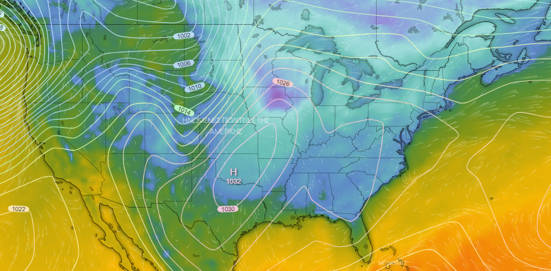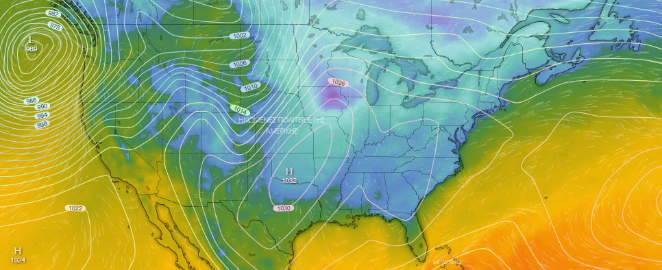 Αυτή την ώρα, πρωί Τρίτης 27 Δεκεμβρίου, όλες οι κεντροανατολικες πολιτείες των ΗΠΑ έχουν θερμοκρασίες κάτω απο το μηδέν (γαλάζιο χρώμα), ενώ μόνο οι δυτικές πολιτείες έχουν κάπως υψηλότερες θερμοκρασίες (πράσινο χρώμα). Ακόμα και μέσα στις ΗΠΑ οι διαφορές είναι εντυπωσιακές με το Λος Άντζελες να έχει 16 βαθμούς το πρωί και το Waterloo στην Αιόβα -23.