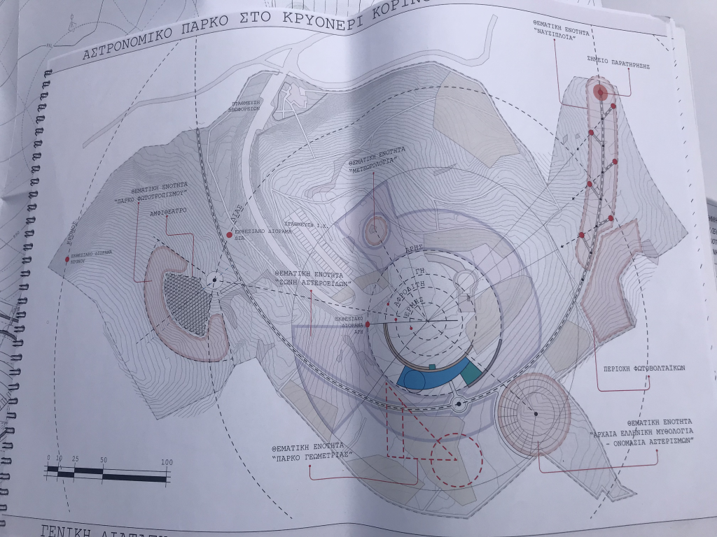 Όπως μπορείτε να δείτε και στην φωτογραφία με το σχεδιάγραμμα ο σχεδιασμός αφορά ένα πολυθεματικό αστρονομικό πάρκο 90 στρεμμάτων, το οποίο – όπως περιέγραψε και ο αρχιτέκτονας μέλος της ομάδας ( με τον Καθηγητή του Ε.Μ.Π. Βασίλη Γκανιάτσα που το σχεδίασαν), Σπύρος Μούντριχας- είναι διαμορφωμένο με βάση τον αστρονομικό χάρτη και την κίνηση των πλανητών.