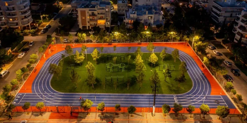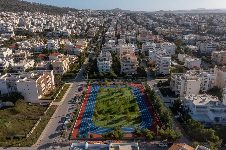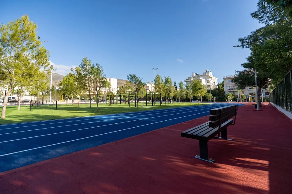 Ένα ολόκληρο οικοδομικό τετράγωνο στη Γλυφάδα μας μεταμορφώθηκε σε ένα σύγχρονο ανοιχτό γήπεδο στίβου, με πολύ πράσινο και πολλά όργανα γυμναστικής στο κέντρο του.