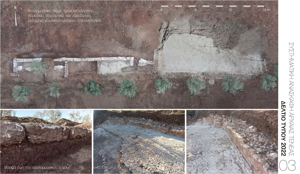 Ανατολικά του νέου ταφικού μνημείου αποκαλύφθηκε σε μήκος 18μ. ισχυρό αναλημματικό τείχος (Εικ. 3), από ορθογώνιους ισομεγέθεις, πώρινους, επεξεργασμένους λίθους. Έχει κατεύθυνση Α/Δ και η κεραμική από την τάφρο θεμελίωσής του είναι πρώιμης κλασικής περιόδου. Σε σημείο του, το τείχος φαίνεται να διακόπτεται κατά τους ρωμαϊκούς χρόνους προκειμένου να κατασκευαστεί υπερμεγέθης δεξαμενή (Εικ. 3) διαστάσεων 15,2μ. x 8,40μ, η οποία πιθανότατα εξυπηρετούσε την υδροδότηση της ρωμαϊκής πόλης.