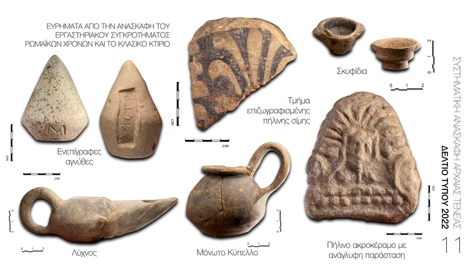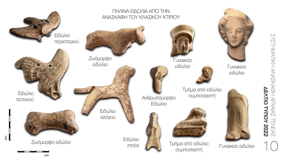 Η ανασκαφή στην αρχαία Τενέα ανέδειξε δημόσιο κτίριο, που ανασκάφηκε σε έκταση 145 τ.μ. (Εικ. 2), με σημαντικά ευρήματα, μεταξύ άλλων και μεγάλη διασπορά αναθηματικών ειδωλίων (Εικ. 10), που συνδέονται πιθανότατα με όμορο λατρευτικό χώρο. Ταυτόχρονα, ανασκάφηκε ισχυρό αναλημματικό τείχος της Πρώιμης Κλασικής Περιόδου στο όριο της πόλης (Εικ. 3).