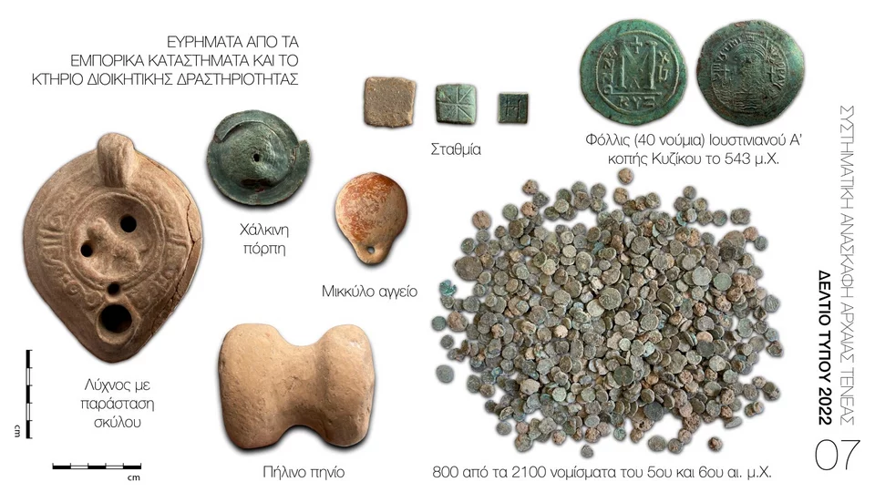 Στον χώρο που διερευνήθηκε φέτος εντοπίστηκαν στο ίδιο στρώμα καταστροφής 2100 νομίσματα του 5ου και 6ου αι. μ.Χ. (Εικ. 7). Μεταξύ αυτών ξεχωρίζουν τα: φόλλις της Κυζίκου του 543 μ.Χ., νούμια των Θεοδοσίου, Μαρκιανού, Λέοντα Α΄, Ζήνωνα, Αναστάσιου, Ιουστίνου Α΄ και Ιουστινιανού Α΄ (Εικ. 7), καθώς επίσης και χάλκινο νόμισμα κοπής Αίγινας του 4ου αι. π.Χ. (Εικ. 16.3).