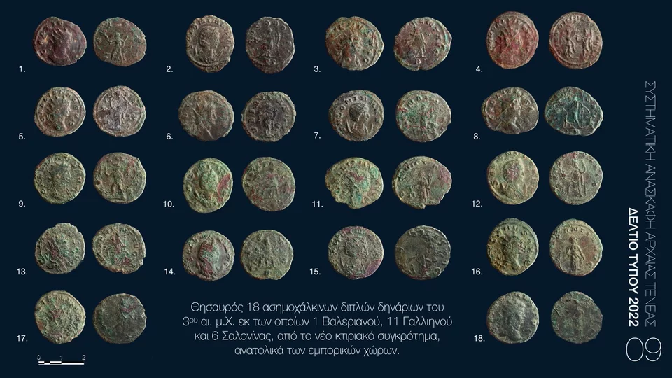 Στο εσωτερικό ενός δωματίου βρέθηκε θησαυρός δεκαοχτώ ασημοχάλκινων νομισμάτων του 3ου αι. μ.Χ., κοπής Βαλεριανού, Γαλιηνού και Σαλονίνας (Εικ. 9).