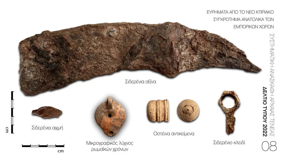 Επιπλέον, βρέθηκαν άλλα δεκατρία νομίσματα του 4ου και 5ου αι. μ.Χ. σιδερένια αξίνα, σιδερένιο κλειδί, σιδερένια αιχμή βέλους, σιδερένια γραφίδα και χρηστική κεραμική ρωμαϊκών χρόνων (Εικ 8).