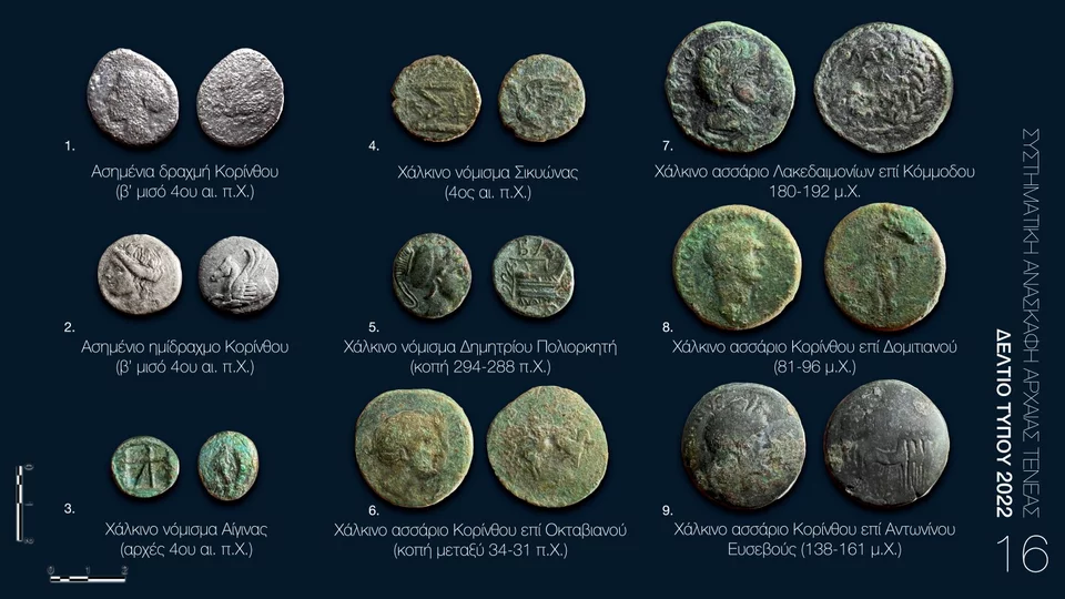 Επιπλέον, βρέθηκαν νομίσματα του 4ου αιώνα π.Χ., όπως δραχμή και ημίδραχμο Κορίνθου (Εικ 16.1, 16.2).