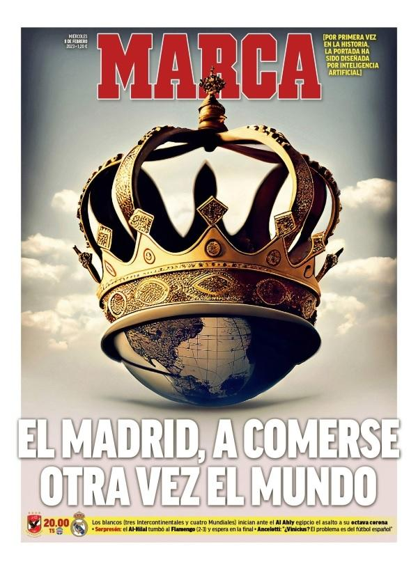 Για την ιστορία, το πρωτοσέλιδο αποτελεί προαναγγελία για τον σημερινό ημιτελικό του Παγκοσμίου Κυπέλλου Συλλόγων ανάμεσα στη Ρεάλ Μαδρίτης και την Αλ Αχλί (21:00), που διεξάγεται στην Ραμπάτ του Μαρόκου και έχει τίτλο «η Μαδρίτη, για να ”φάει” άλλη μία φορά τον κόσμο”».