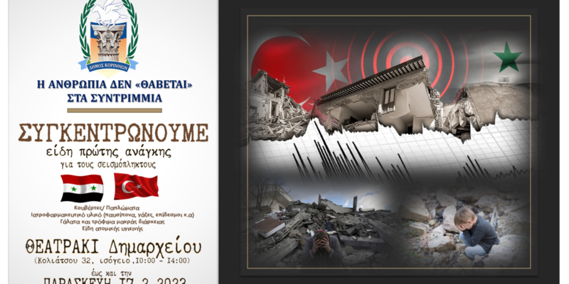 Σε συγκέντρωση ειδών πρώτης ανάγκης για τους σεισμοπλήκτους στην Συρία και την Τουρκία, προχωρά ο δήμος Κορινθίων με την συνδρομή, συμβολή και συμμετοχή των πολιτών του, ενώνοντας τις δυνάμεις του με άλλους δήμους και φορείς που προχωρούν σε ανάλογες ενέργειες, πρεσβεύοντας πως η ανθρωπιά, η αλληλεγγύη, η βοήθεια, ούτε σύνορα έχουν, ούτε στα συντρίμμια θάβονται.