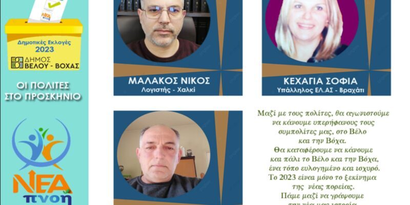 Tους πρώτους υποψήφιους ανακοίνωσε ο Θανάσης Μανάβης, υποψήφιος δήμαρχος του δήμου Βέλου-Βόχας. Νέα πρόσωπα που θα ασχοληθούν για πρώτη φορά ενεργά με τα δημοτικά πράγματα και έχουν διαγράψει την προσωπική και επαγγελματική τους πορεία.