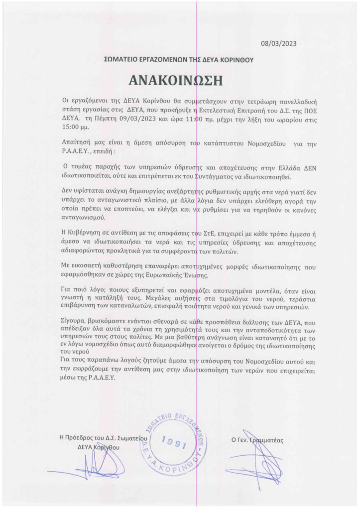 Ανάμεσά τους είναι και οι εργαζόμενοι στην ΔΕΥΑ Κορίνθου, οι οποίοι αναφέρουν πως το κατάπτυστο νομοσχέδιο πρέπει να αποσυρθεί.