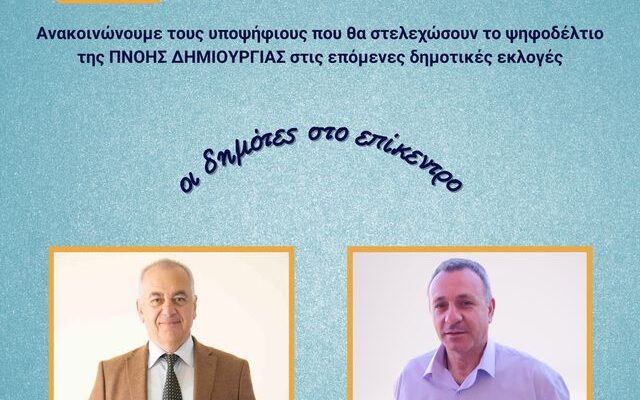 Ανακοινώνουμε δύο ακόμα υποψηφίους που θα στελεχώσουν τη ΠΝΟΗ ΔΗΜΙΟΥΡΓΙΑΣ και το ψηφοδέλτιο στις επόμενες δημοτικές εκλογές.
