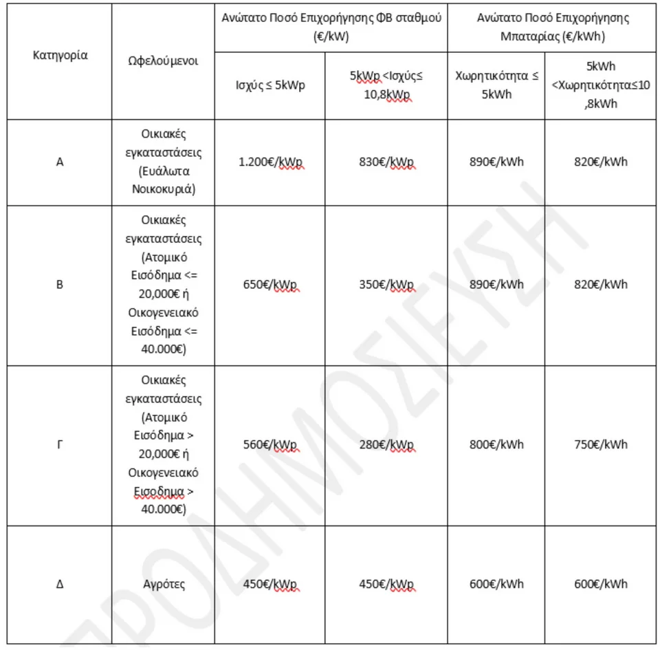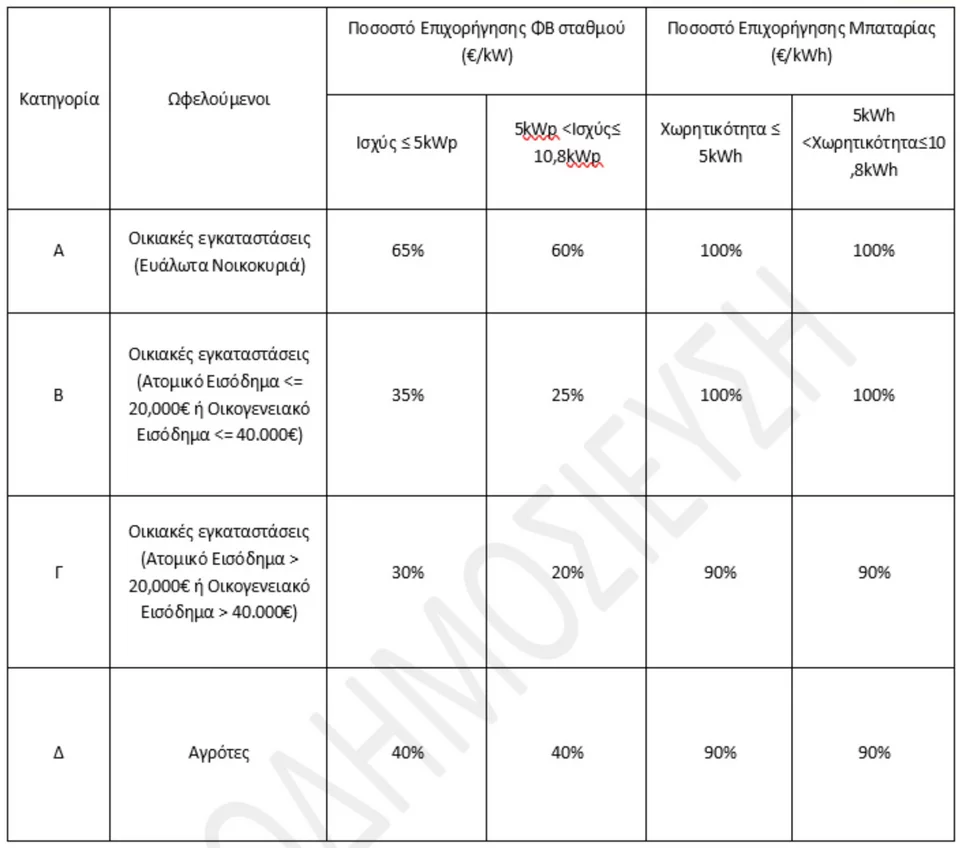 Η συνολική επιδότηση του συστήματος φωτοβολταϊκού με μπαταρία μπορεί να φτάσει έως και 16.000 ευρώ για νοικοκυριά και 10.000 ευρώ για αγρότες.