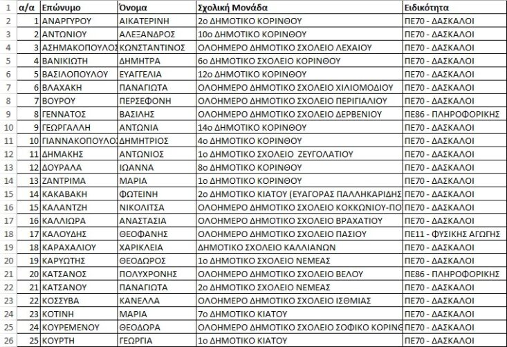 Τους νέους διευθυντές στα Δημοτικά σχολεία της Κορινθίας ανακοίνωσε το Τοπικό Συμβούλιο Επιλογής. Οι νέοι διευθυντές θα αναλάβουν τα καθήκοντά τους, εντός των τριών τελευταίων εργάσιμων ημερών του διδακτικού έτους.