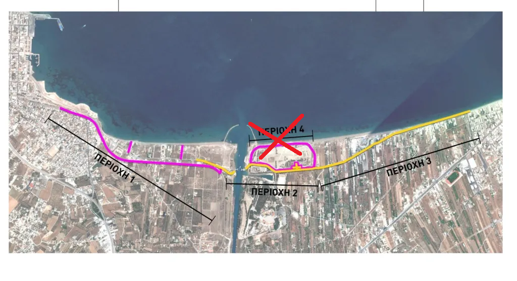 Με μία σημαντική διαφοροποίηση στον αρχικό σχεδιασμό προκηρύχτηκε από τον Δημόπρακτο το έργο της ανάπλασης του ενιαίου παραλιακού μετώπου μεταξύ Κορίνθου Λουτρακίου. Συγκεκριμένα, ενώ το αρχικό σχέδιο προέβλεπε ανάπλαση σε τέσσερις ζώνες, η προκήρυξη του διαγωνισμού περιορίζεται σε τρεις, καθώς δεν θα υπάρξει παρέμβαση στην περιοχή 4, στην βόρεια δηλαδή πλευρά του στρατοπέδου της Σχολής Μηχανικού (δείτε στον χάρτη)!