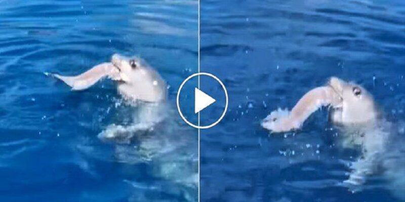 Το θηλαστικό των φωκίδων αφού έχει φτάσει κοντά στη βάρκα των αλιέων, αρπάζει ένα μεγάλο ψάρι και το «χλαπακιάζει» μπροστά τους. Εκείνοι δεν χάνουν την ευκαιρία να καταγράψουν σε βίντεο το συμβάν που κάθε άλλο παρά συχνό είναι.