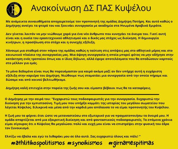 Λένε ότι την ποιότητα δυο ανθρώπων την καταλαβαίνεις όταν χωρίζουν. Υπό αυτή την έννοια η ποιότητα των ανθρώπων που διοικούν τον Κύψελο και του (τέως πλέον) προπονητή της ομάδας την καταλαβαίνει κανείς από την παρακάτω ανακοίνωση που περιγράφει το “διαζύγιο” αναμεσα στις δύο πλευρές, αλλά κυρίως τους λόγους του.